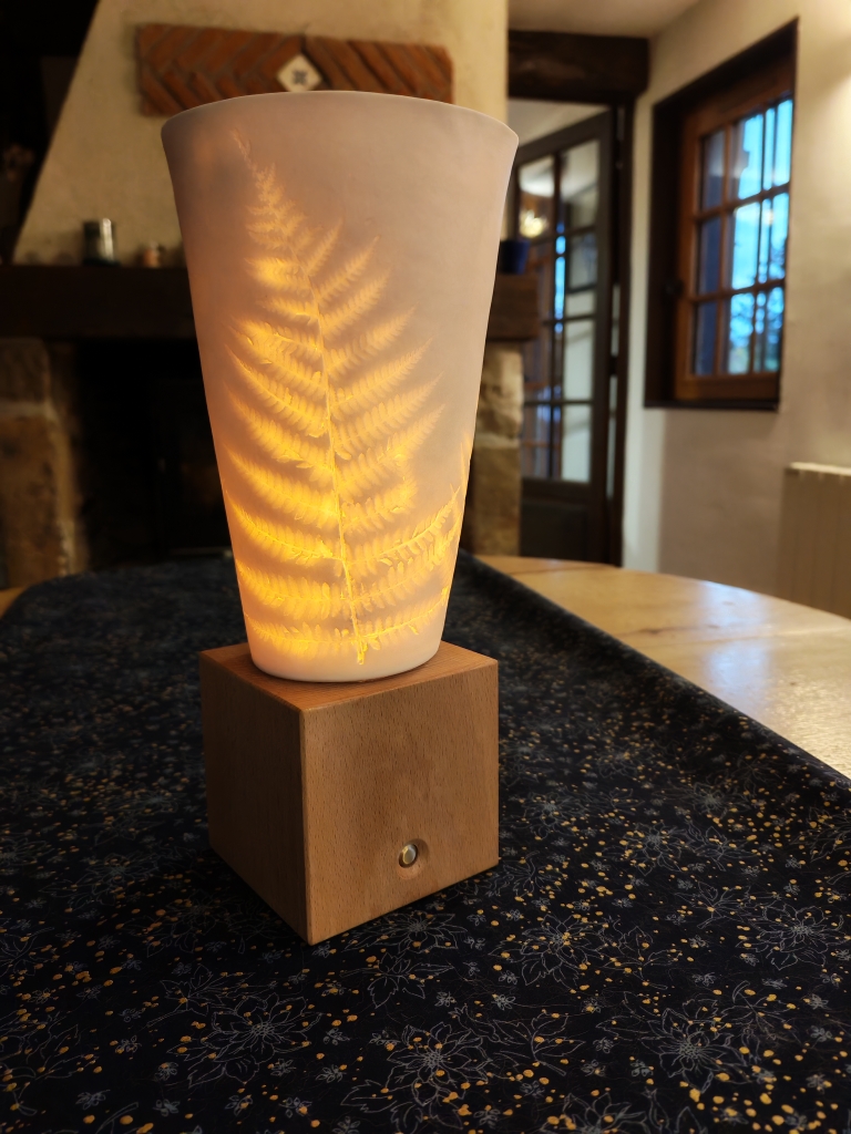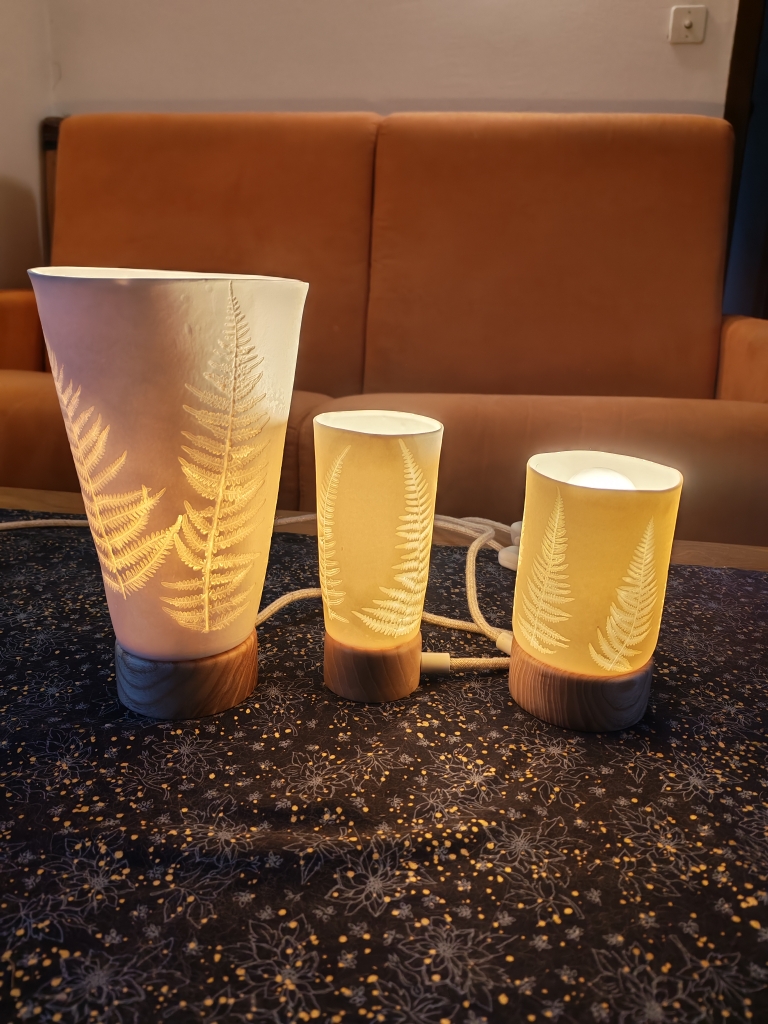 La lumière révèle la translucidité de la porcelaine et l’empreinte ciselée des végétaux que nous avons soigneusement choisis pour nos luminaires et photophores : Fougères, Potentille ansérine, Phacélie…