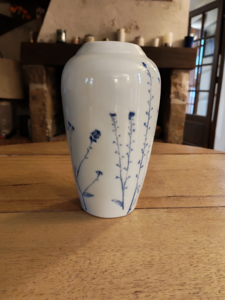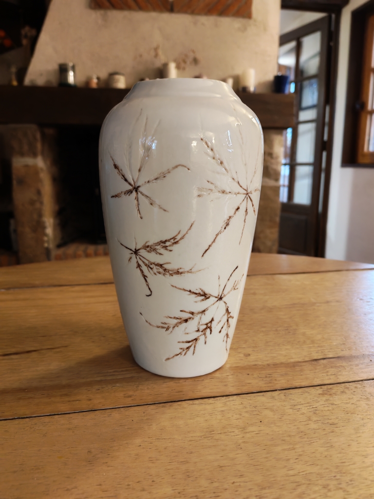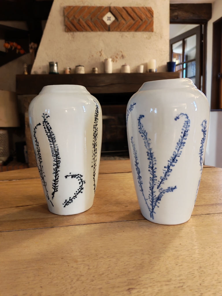 Après confection de nos moules en plâtre, nous coulons la porcelaine et décorons nos vases avec les végétaux de notre herbier : Érable du Japon, Rose de Damas, Lin…